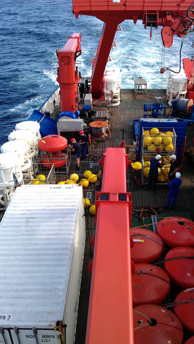 In two days we hope to deploy the first mooring. This involves quite some logistics: all instruments have to aligned in the right order! Yvo and Barry (both wearing white helmets in the middle of the photo) are arranging everything together with the ship´s crew.