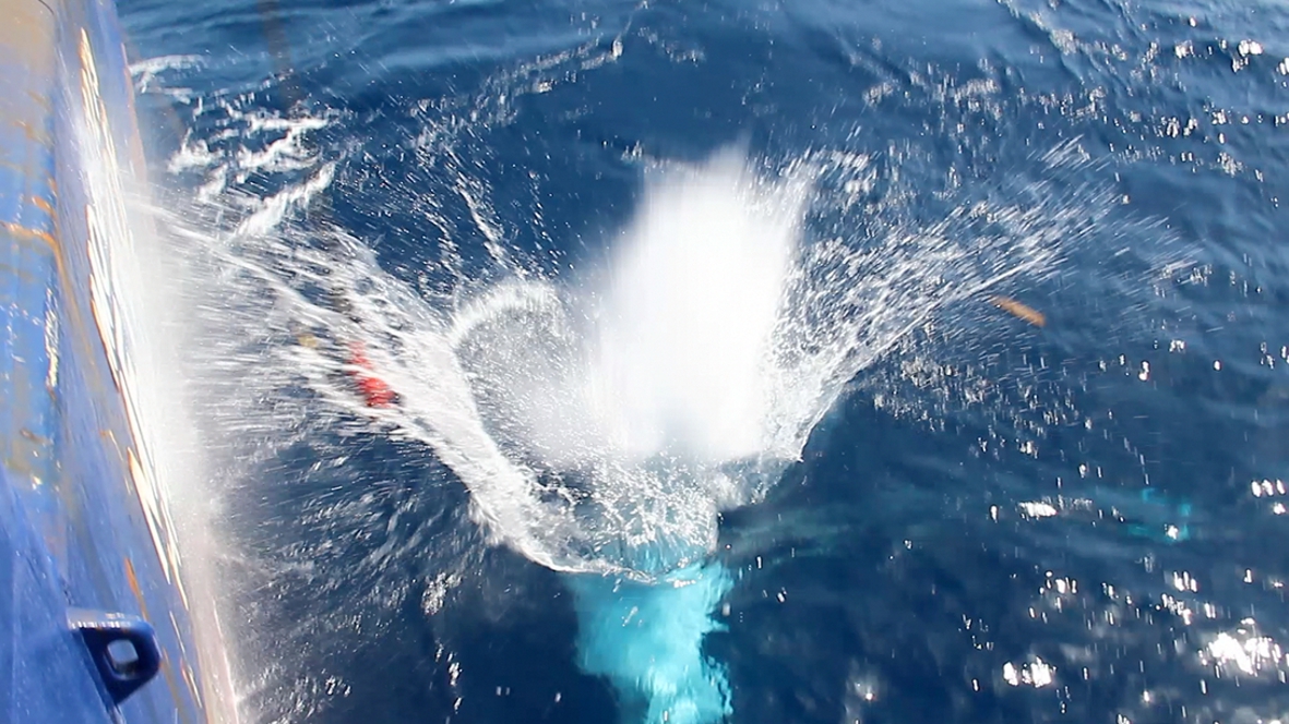 Here you see how a sediment trap is deployed. It’s too heavy to lift by hand, so it requires a crane.