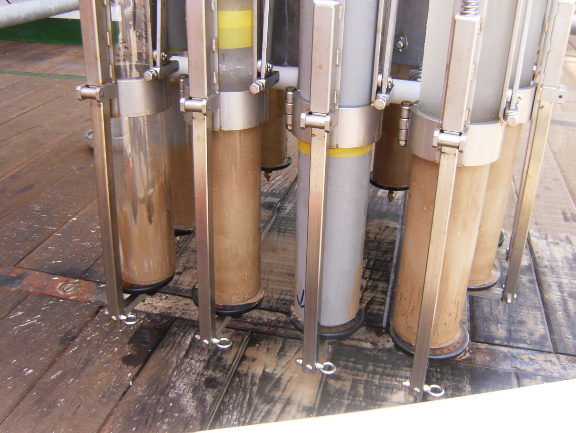 The sediment traps; about 2m high polyester funnels that end in a cup attached to a caroussel that contains 24 cups which rotate under the funnel’s end at a pre-programmed interval.